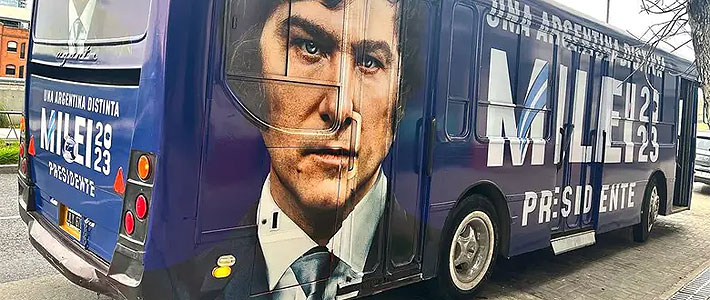 En las últimas semanas, Milei recorrió las rutas del país en un motorhome, acompañado de otro vehículo que se llevó todas las miradas: un colectivo ploteado con su rostro y la leyenda "Milei 2023". El primer tramo de su "tour de la libertad", como denominó a la gira, tuvo como principales destinos a las ciudades de Rosario, Paraná y Córdoba. Pocos días después retomó viaje hacia Mar del Plata y Bahía Blanca, y finalizó su campaña itinerante con una visita relámpago a Mendoza.