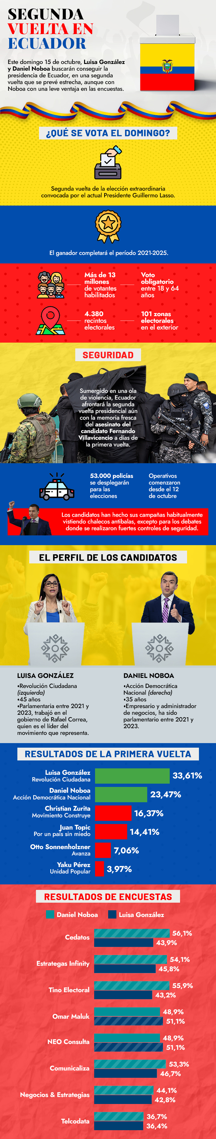 Más de 13 millones de ecuatorianos podrán acudir a las urnas para escoger a quien sería su presidente más joven de la historia, Daniel Noboa, o la primera mujer en ocupar el cargo, Luisa González.