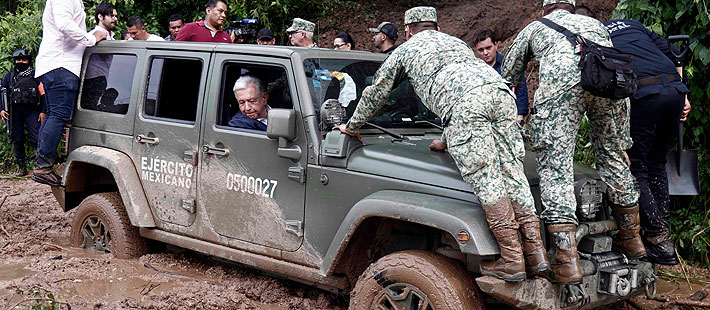 El vehículo que llevaba a Andrés Manuel López Obrador quedó atrapado en el barro. Tras ello, el Mandatario debió moverse a pie (Foto: AFP).