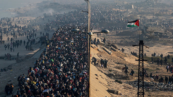Una columna de decenas de miles de palestinos están cruzando este lunes al norte de la Franja de Gaza cargados con sus enseres, a pie o en vehículos, para reunirse con sus familias, buscar a sus desaparecidos o intentar encontrar sus casas en calles arrasadas e irreconocibles.