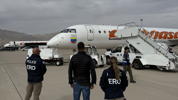 La Casa Blanca adjuntó una fotografía que muestra a Grenell observando cómo un grupo de migrantes venezolanos, con las manos esposadas, abordan un avión de la aerolínea venezolana Conviasa, vigilados por agentes de migración.