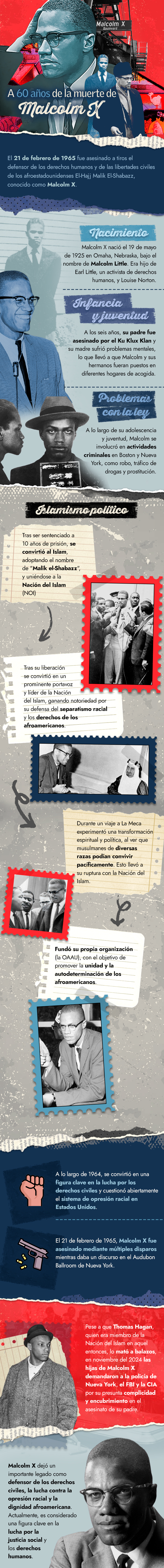 El 21 de febrero de 1965 fue asesinado a tiros El-Hajj Malik El-Shabazz (nombre adoptado tras convertirse al Islam), considerado actualmente como una figura clave en la lucha por la justicia social y los derechos humanos.