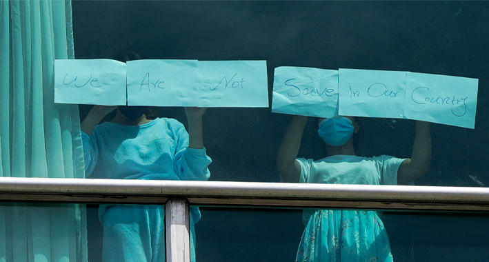 Sin poder salir, aunque el gobierno niega que estuvieran detenidos, fueron instalados primero en el hotel Decápolis, en la capital, bajo custodia policial. "Por favor, ayúdennos", decía un letrero que colgaron en una ventana.