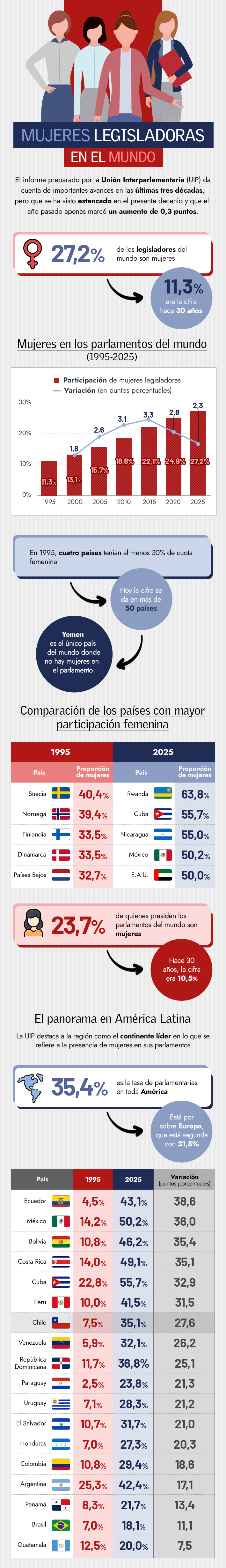 Si ahora representan el 27,2% de los escaños, hace tres décadas eran sólo el 11,3%, un avance que se ha ralentizado en la última década, según la Unión Interparlamentaria.