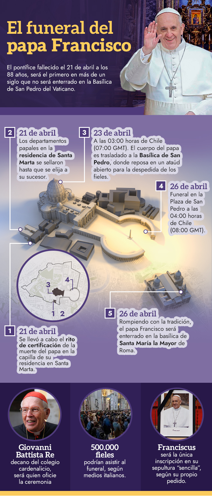 La misa en la plaza de San Pedro comenzará el sábado a partir de las 04:00 horas de Chile y contará con la presencia, además de medio centenar de líderes de gobierno, de diez monarcas en ejercicio.