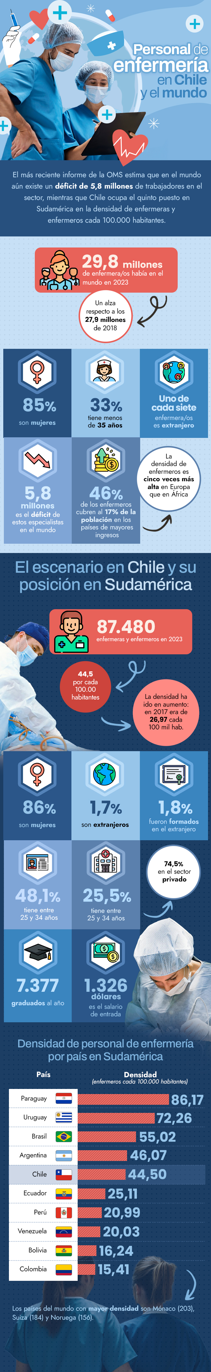 Chile es quinto en Sudamérica en densidad de personal de enfermería: Un 86% son mujeres y 1,7% extranjeros
