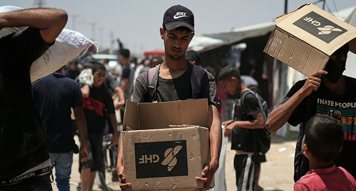 Joven en Gaza carga caja con comida como parte de la ayuda humanitaria entregada. | AP