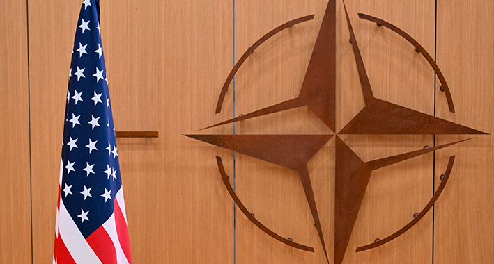 Emblema de la OTAN junto a bandera de los Estados Unidos. | AFP