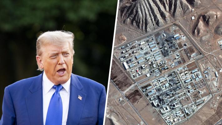 El presidente Donald Trump y una imagen satelital proporcionada por Maxar Technologies, tomada el 24 de junio de 2025, muestra una vista general de la planta de enriquecimiento nuclear de Isfahán y los túneles cercanos en el centro de Irán.