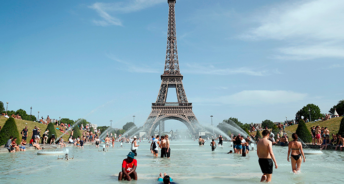 Personas se refrescan frente a la Torre Eiffel. | AFP