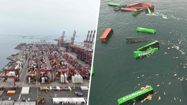 Medios locales difundieron fotografías en las que se veía decenas de contenedores en el mar, algunos de ellos abiertos con sus mercancías esparcidas en el agua.