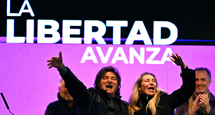 Javier y Karina Milei durante mitin del LLA. | AFP