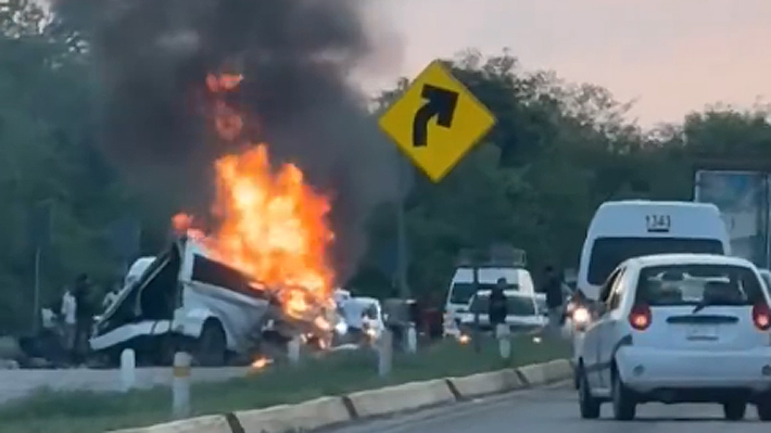 Tras el choque, la camioneta, que funcionaba como transporte colectivo, quedó envuelta en llamas y atravesada en la carretera, se observa en imágenes de la prensa local.