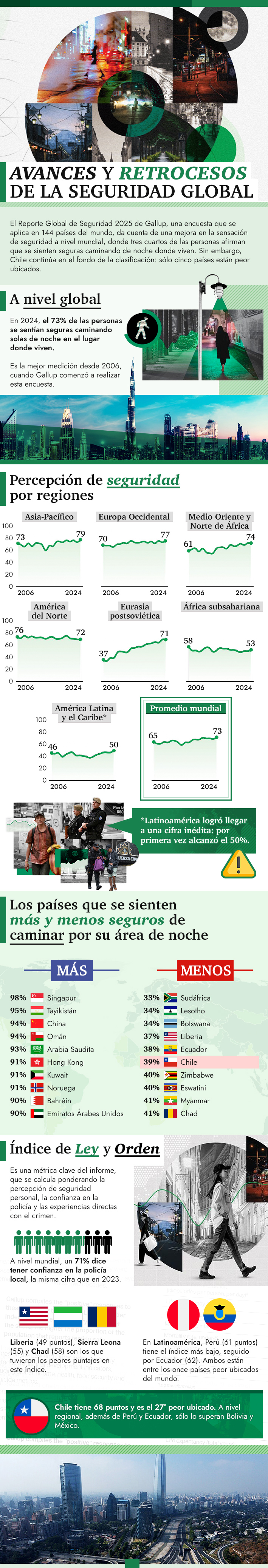 De acuerdo al Reporte Global de Seguridad 2025 de Gallup, un sondeo a 145 mil personas en 144 países, el 39% de los chilenos no se siente seguro de caminar solo de noche en el lugar donde vive.