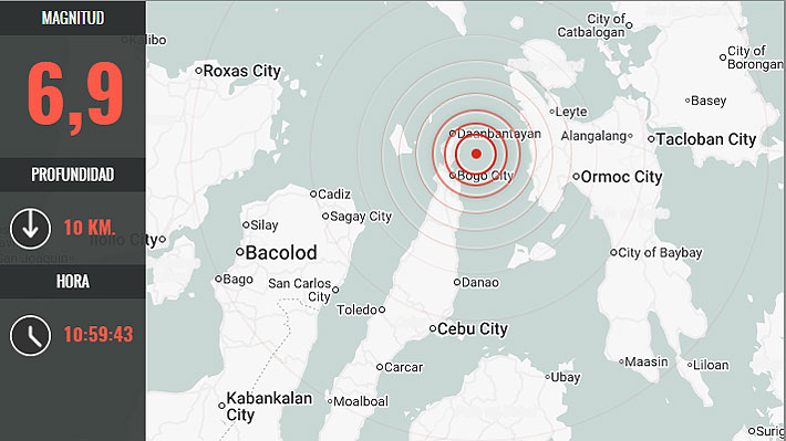 El sismo tuvo lugar a las 21:59 hora local (10:59?hora chilena) a una profundidad de diez kilómetros cerca de la ciudad de Bogo, en la región central de Cebú, aseguró Phivolcs en un comunicado en el que elevó la magnitud a 6,9 frente al 6,7 reportado inicialmente.