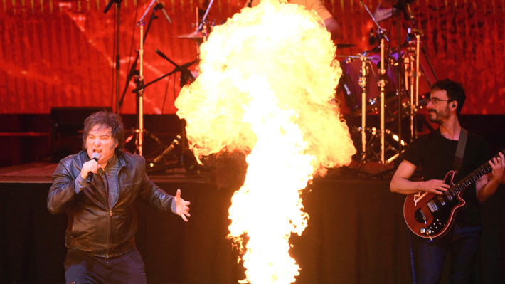 El presidente Javier Milei inició su acto musical en el Movistar Arena, donde presentó este lunes por la noche su nuevo libro "La construcción del milagro", al ritmo de Demoliendo Hoteles de Charly García.