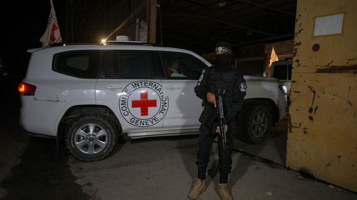 Vehículo de la Cruz Roja llega a Gaza para transportar los cuerpos entregados por Hamás.