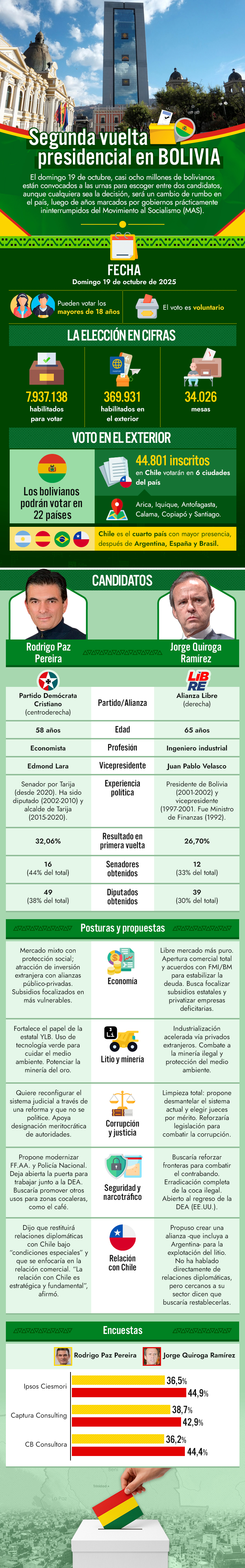 Los dos postulantes, Rodrigo Paz y Jorge Quiroga, representan un cambio respecto a los gobiernos de izquierda del Movimiento al Socialismo (MAS) que han sido prácticamente ininterrumpidos desde 2006.
