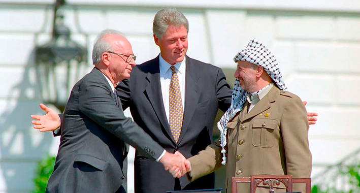 Isaac Rabin, Bill Clinton y Yasser Arafat durante la firma de los Acuerdos de Oslo. | Wikimedia