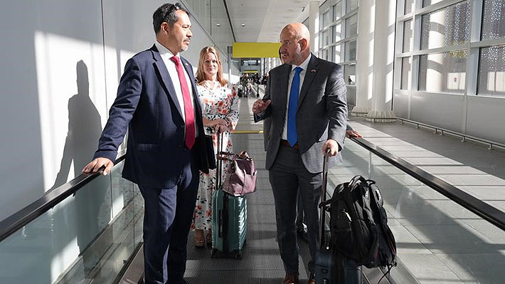 Brandon Judd (derecha) fue recibido este lunes por personal de la embajada estadounidense en el aeropuerto de Santiago.