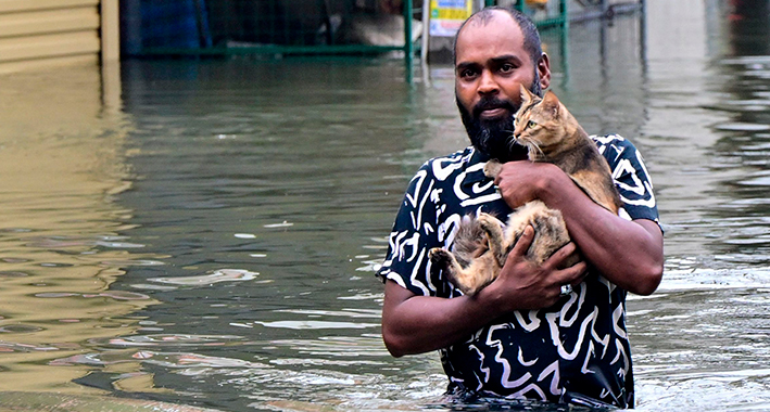 Hombre rescata a gato en las inundaciones de Sri Lanka. | AFP
