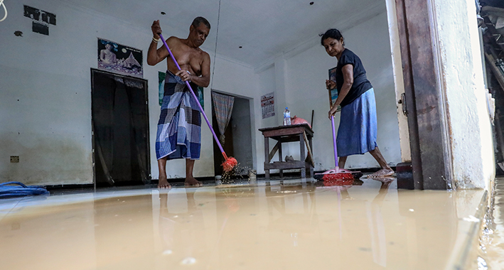 Personas sacan el agua de sus casas en Sri Lanka. | EFE