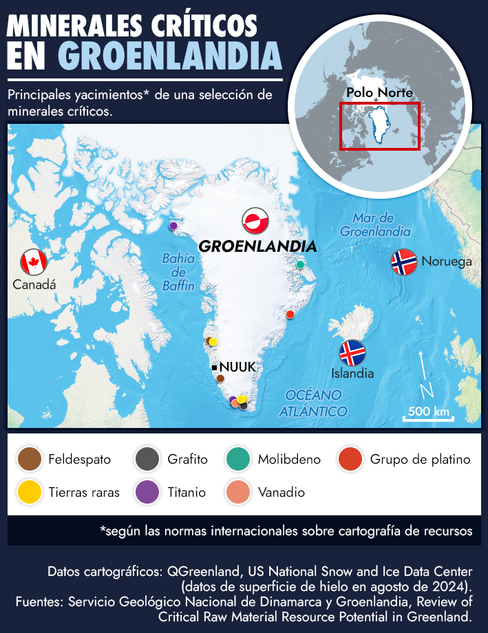 Algunos análisis estiman que Groenlandia podría contener hasta el 25% de las tierras raras no descubiertas del planeta, además de importantes recursos de zinc, plomo, cobre, oro, molibdeno, grafito, niobio, tantalio y otros minerales críticos.