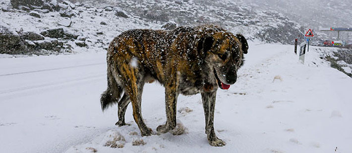 Un perro camina por una carretera cubierta de nieve en las montañas de Serra da Gralheira en medio del paso de la tormenta Ingrid en Cinfaes, Portugal. FOTO: EFE