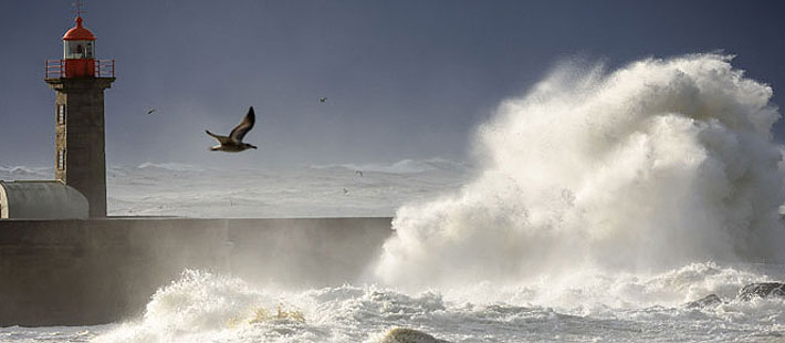 Fuertes olas cerca del faro de Cabedelo en Porto, Portugal. FOTO: EFE