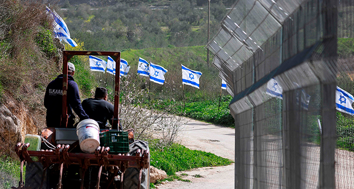 Granjeros palestinos frente a banderas de Israel en Cisjordania. | AFP