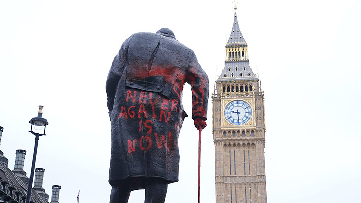 La histórica estatua de Churchill —primer ministro británico durante la Segunda Guerra Mundial y figura central de la historia política del Reino Unido— fue encontrada cubierta de grafitis con frases como: