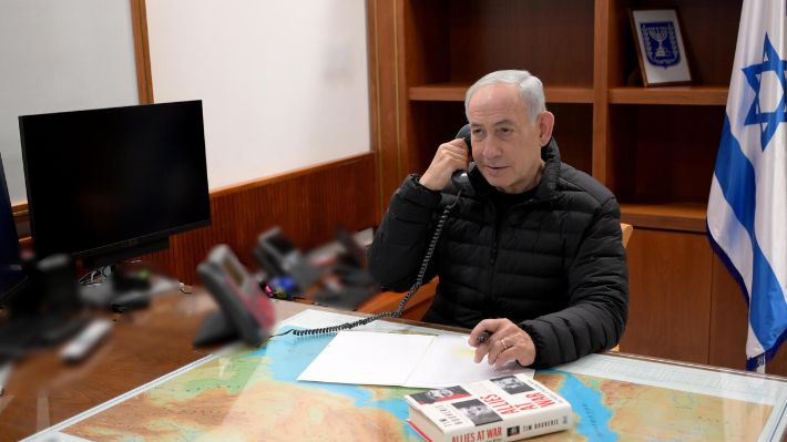 En tanto, la oficina de Netanyahu publicó la foto en la que se le ve hablando por teléfono en su despacho con un mapa de la región sobre la mesa, una carpeta de folios y el libro 'Aliados en guerra', sobre las potencias aliadas durante la Segunda Guerra Mundial (1939-1945).