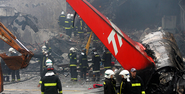Un Airbus A320 de la aerolínea brasileña TAM se sale de la pista al aterrizar en el aeropuerto de Congonhas, en Sao Paulo (Brasil) y choca contra un edificio causando 199 muertos (187 ocupantes del avión y 12 alcanzados en tierra).