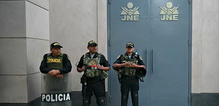 Policías resguardan las oficinas del Jurado Nacional de Elecciones (JNE) en Perú. | AFP
