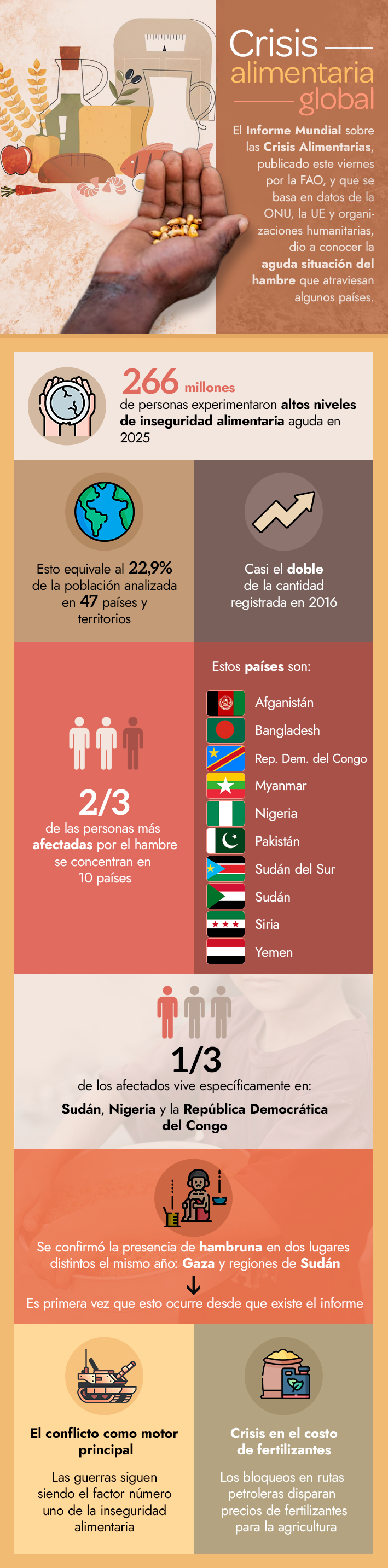 Un informe de la FAO reveló que 266 millones enfrentaron hambre aguda en 2025.