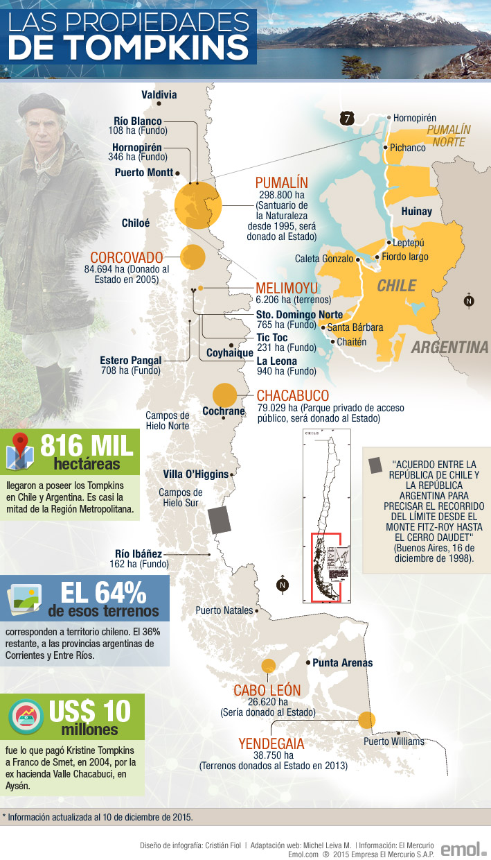 El ecologista falleció el pasado 8 de diciembre tras un accidente ocurrido mientras practicaba kayak. Junto a su familia llegó a tener 816 mil hectáreas en Chile y Argentina, equivalente casi a la mitad del terreno que ocupa la Región Metropolitana.