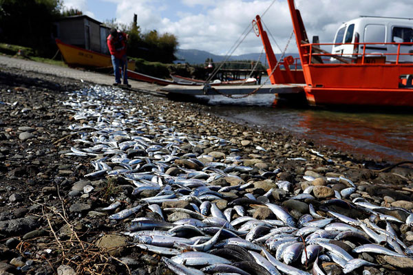 TEMUCO.- Un total de 10 camiones del Ministerio de Obras Públicas trabajan en la Caleta Queule apoyando la extracción de las más de 8 mil toneladas de peces muertos en la orilla.