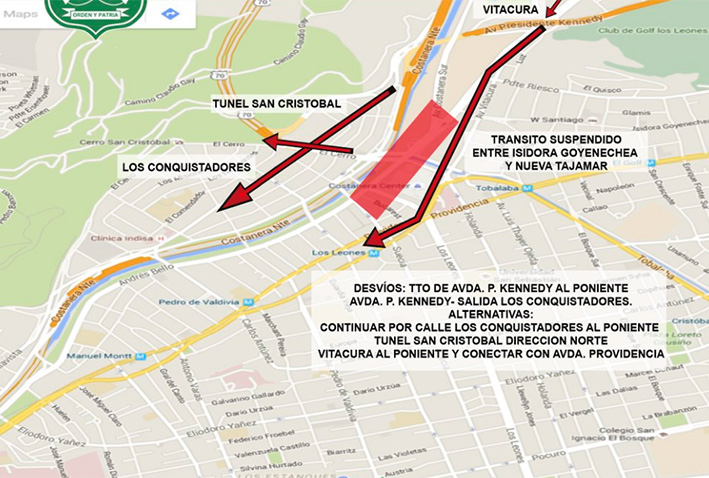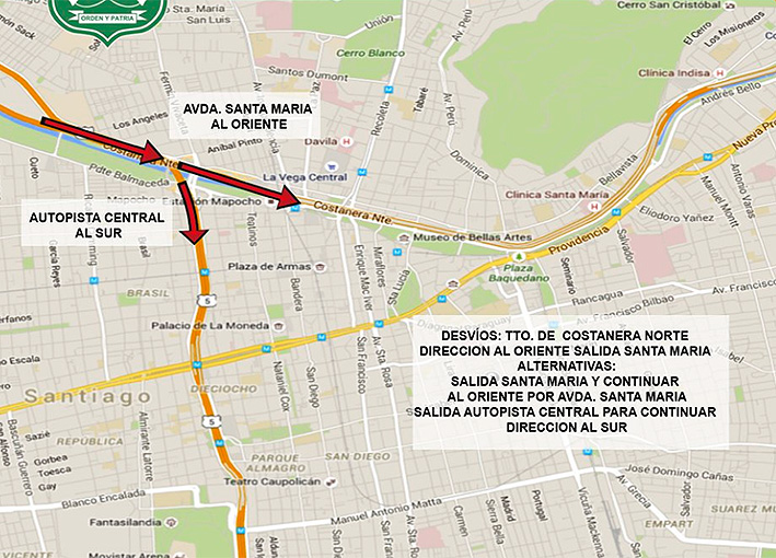 SANTIAGO.- Tras el fenómeno climático que afectó a la capital y que generó la inundación de sectores de la Autopista Costanera Norte, Carabineros de Chile informó los desvíos que se aplicarán el lunes 18 de abril con el objetivo de mantener el flujo de automovilistas en la zona.