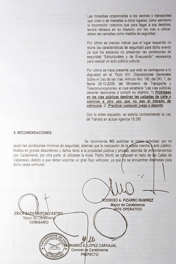 "Se recomienda NO (sic) autorizar la citada actividad por no reunir las condiciones mínimas de seguridad. Además, la realización de la citada marcha y acto público finaliza en graves desórdenes y daños tanto a la propiedad pública y privada", señala el documento firmado por el prefecto de Carabineros de Valparaíso, coronel Fernando López.