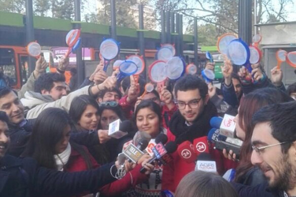 "Trajimos coladores para que nunca más se cuelen universidades que lucran con la educación", señaló el presidente de la Feusach y vocero de la Confech, Patricio Medina, quien participa en la manifestación.