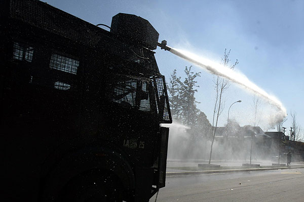 Ante el hecho, efectivos de Fuerzas Especiales de Carabineros acudieran al lugar, utilizando el carro lanzaaguas y bombas lacrimógenas.