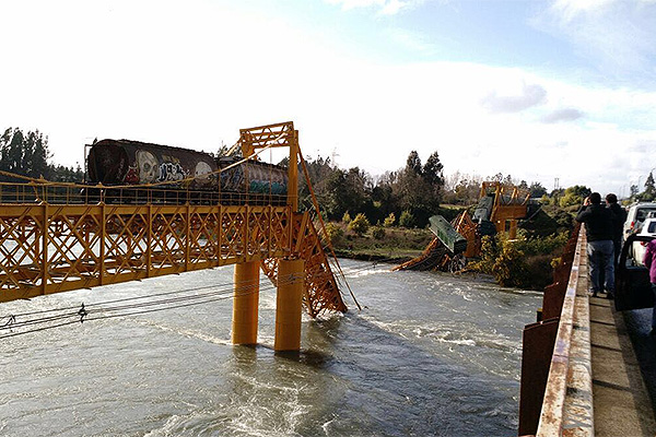 PITRUFQUÉN.- Tras la caída al río Toltén de un tren de carga debido al desplome de un puente ferroviario, la Empresa de Ferrocarriles del Estado (EFE) informó esta tarde que hasta el momento se ha identificado un carro con filtraciones, el cual transportaba soda cáustica.