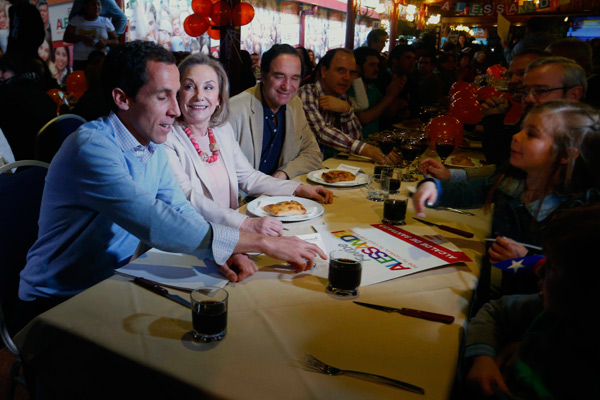 La ex primera dama Cecilia Morel y los presidentes de la UDI, Hernán Larraín, y RN, Cristián Monckeberg, en una actividad en apoyo al candidato a alcalde de Santiago Felipe Alessandri.