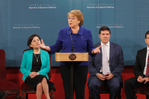 Antes de iniciar su discurso durante la promulgación de la ley que establece un sistema de aportes al espacio público, la Mandataria señaló que "estoy muy contenta con lo que sucedió ayer en el Senado, cuando se aprobó el proyecto de elección popular de los intendentes regionales".