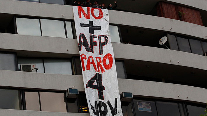 SANTIAGO.- Miembros del movimiento No+AFP se tomaron las dependencias de la Asociación Gremial de AFP, argumentando que estas son pagadas por los cotizantes del Sistema de Fondos de Pensiones (SFP)