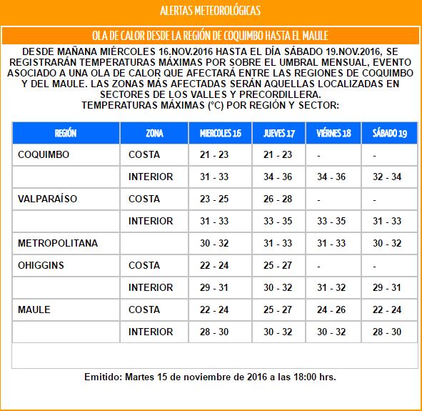 SANTIAGO.- La Dirección Meteorológica de Chile emitió una alerta por la ola de calor que afectará al país desde la región de Coquimbo hasta el Maule.