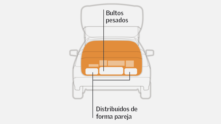 Deben ir abajo de todo. Así se mantiene el centro de gravedad lo más bajo posible. Al distribuirlos, se debe evitar que quede más peso a un lado del auto. Al terminar, revise que el vehículo no quede inclinado hacia algún lado.
