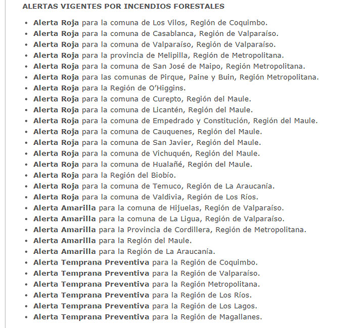 Según información proporcionada por la Dirección Meteorológica de Chile, se indica que durante la jornada de ayer hubo predominio de una baja presión oceánica, permitiendo que las columnas de humo de los incendios se mantengan en niveles bajo los 3.000 metros, pudiéndose observar gran cantidad de humo en los valles interiores entre las regiones Metropolitana y Biobío. Por esta razón, disminuyeron las temperaturas máximas entre 3° y 5°C en promedio, respecto a las máximas pronosticadas.