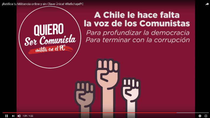 SANTIAGO.- "A Chile le hace falta la voz de los comunistas", "Quiero ser comunista, milita en el PC", o "Chile necesita un Partido Comunista Legal", son algunos de los mensajes que enfatiza un video lanzado esta semana por esa colectividad a través de distintas redes sociales. En la grabación se hace un llamado a los militantes a concretar el trámite de reinscripción en el partido por internet.