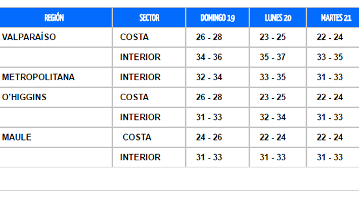 "Desde este domingo y hasta el martes 21 de febrero se registrarán temperaturas máximas por sobre el umbral mensual, evento asociado a una ola de calor que afectará entre las regiones de Valparaíso y El Maule", informó el organismo.